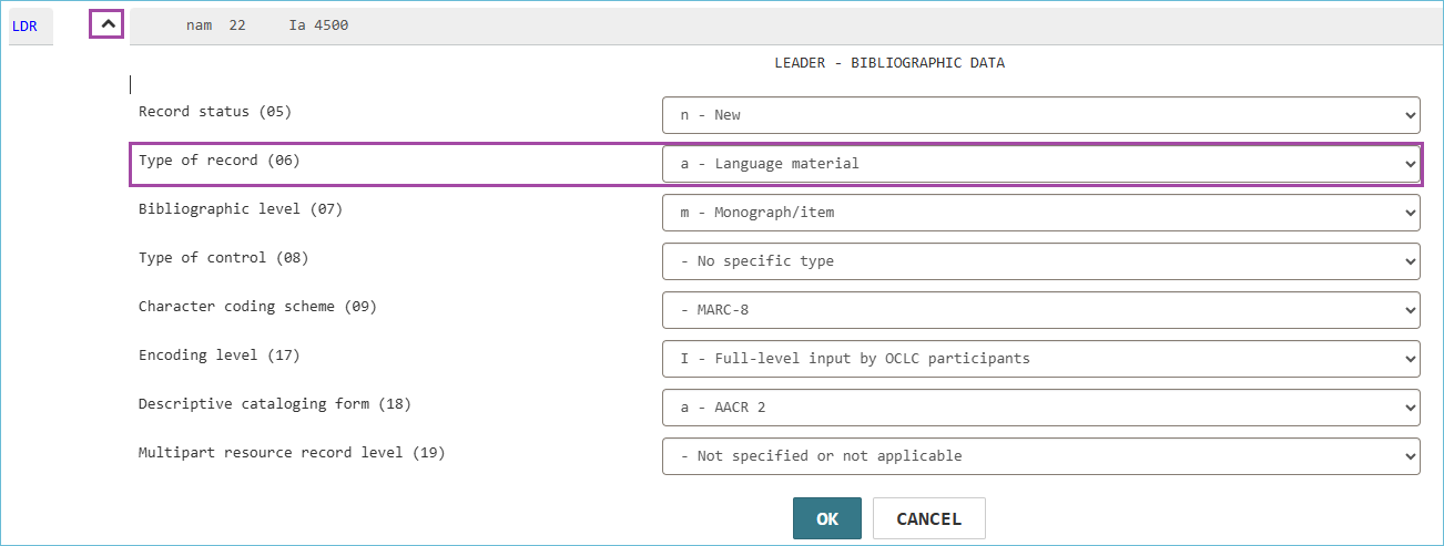 Working left to right in the chart from Polaris, we can check the Leader position 06 (LDR/06). In Leap, click the arrow icon next to the LDR field to open the work form.
