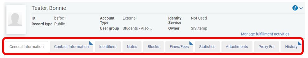 Several components of the patron record can be viewed and potentially updated: General Information, Contact Information, Identifiers, Notes, Blocks, Fines/Fees, Statistics Attachments, Proxy For and History. Note: a tab with a ‘folded’ corner indicates there is information in that tab. Tabs without the folded corner are empty.
