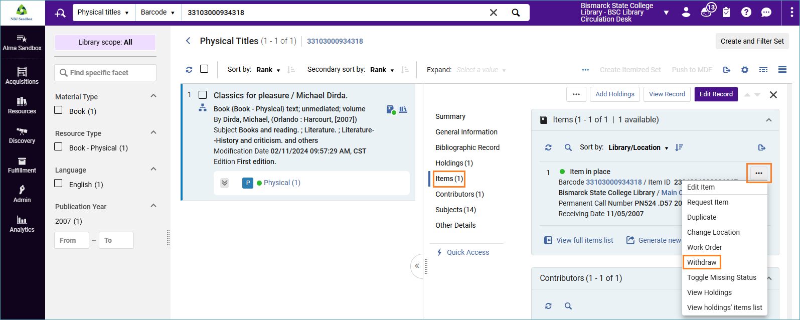 1. Perform a search for the item record. A simple way to find the item is by doing a Physical Titles search by barcode.