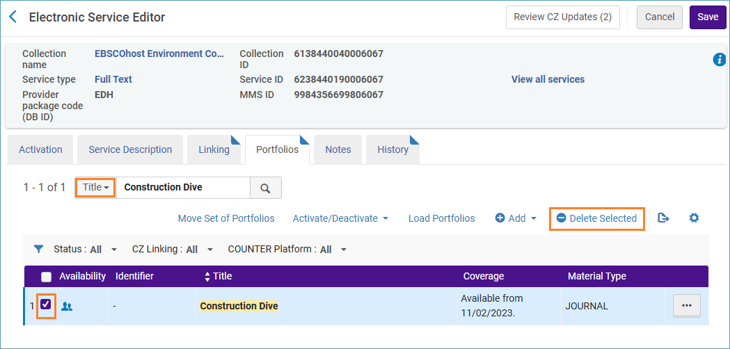 1. Select the portfolio you want to delete. You can search the list by ISBN, ISSN, and title. Check the box next to the portfolio and click Delete Selected