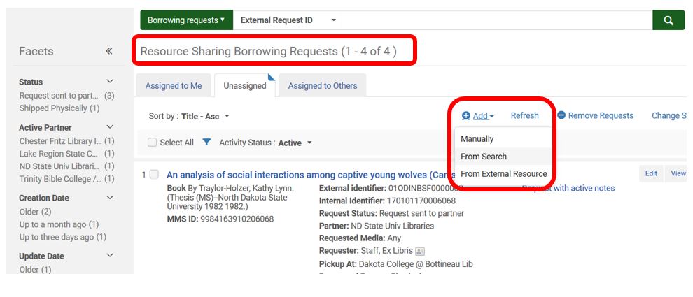 3. The Resource Sharing Borrowing Requests page is displayed. Borrowing requests, plus facets to work with the requests, are displayed. To create a new request, select +Add and choose if you wish to add a manual request, a request from a search or a request by searching an external source. In this example we will add a request from search.